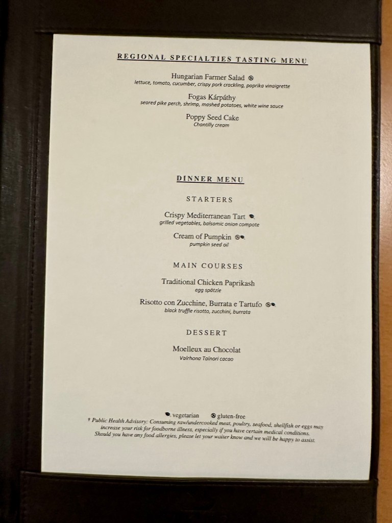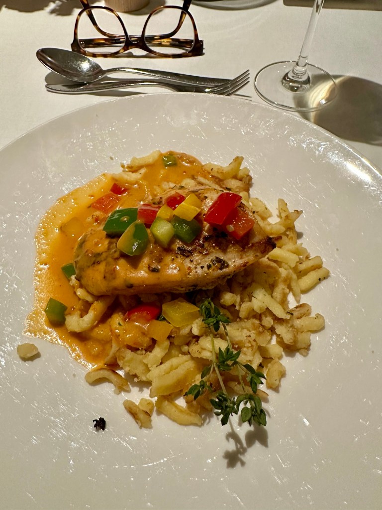 They always have the standard choices of steak, chicken, some fish, creme brûlée, etc. Tonight I’m going with the farmer’s salad and the traditional chicken paprikash. It has spaetzel so it feels like I can’t go wrong.