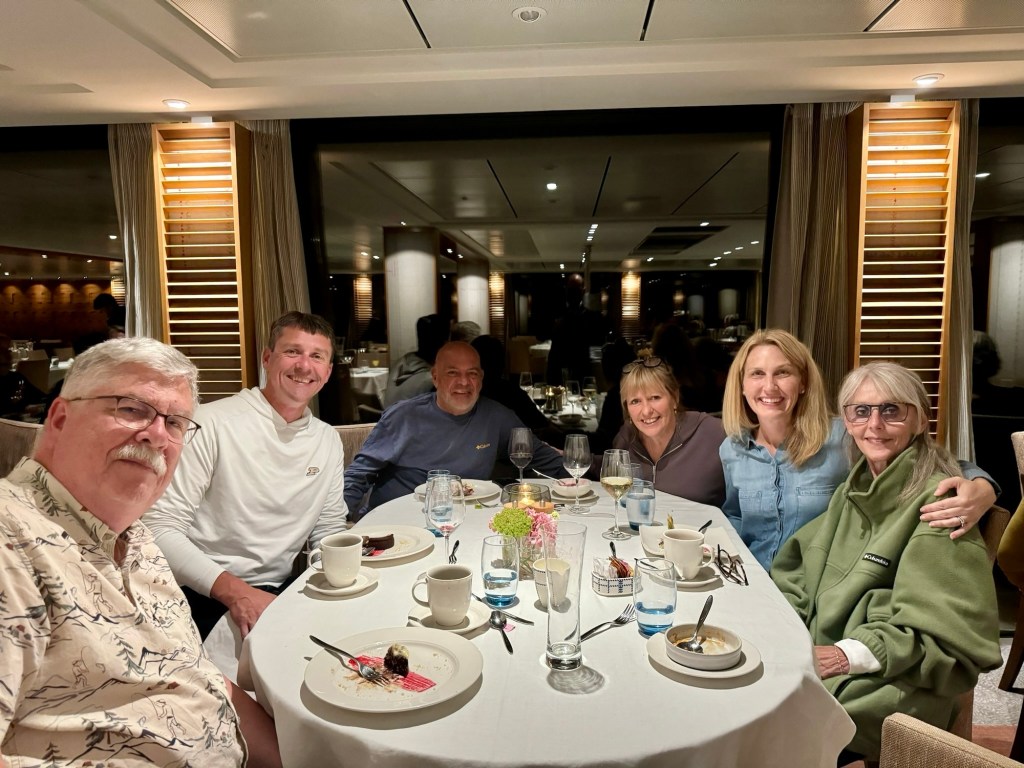 A little more about dinner. It’s open seating and only one sitting. The smallest tables in the dining room have 6 chairs. There are some 8 and 10 top tables as well. That’s how we ended up sitting with Sherry and Gary Thursday evening.