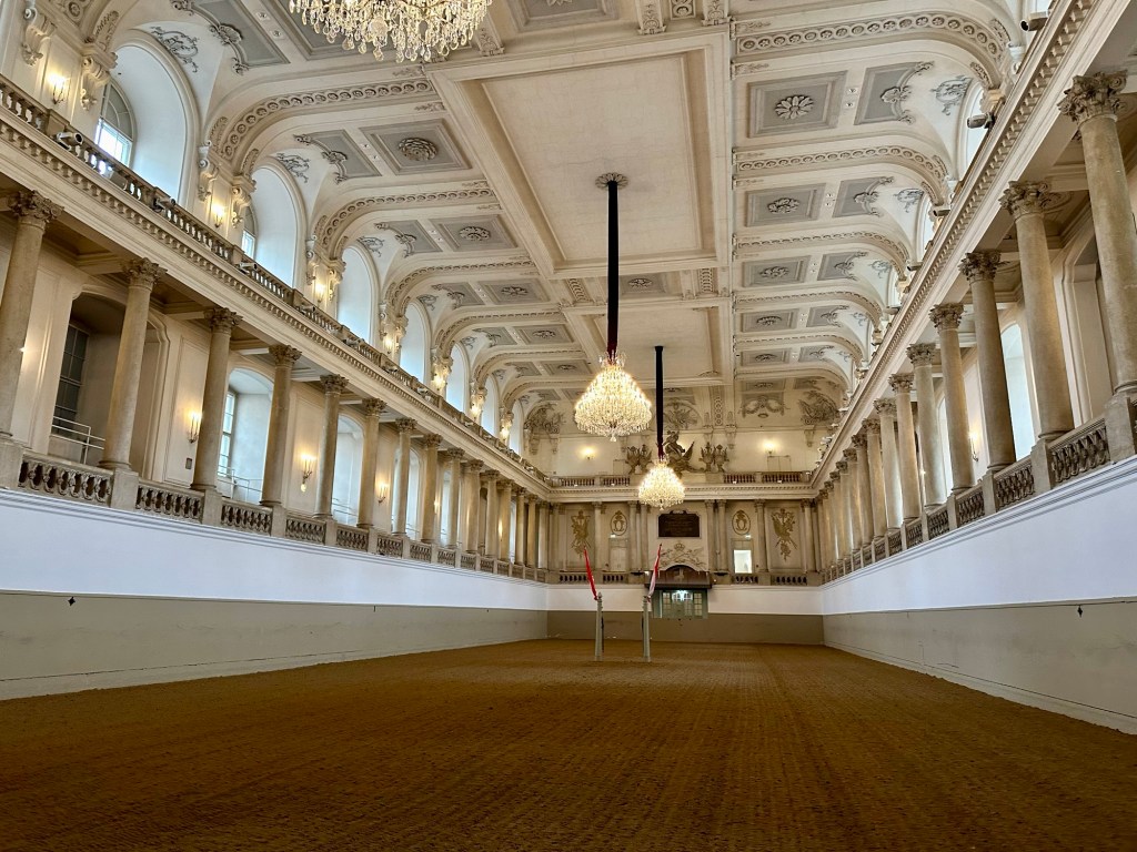 The school only had an outdoor arena until Charles VI built one between 1729-1736. He wanted to be acknowledged for building this so there is a huge painting of him inside the arena. The riders take their hats off as they get to center ring as a thank you to him to this day.