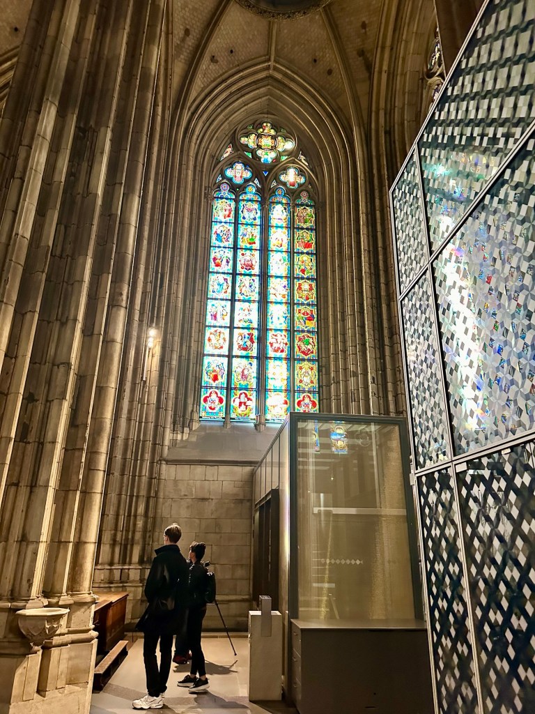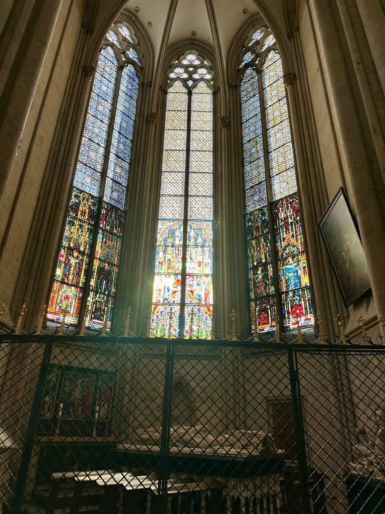 The arrival of the bones of the three Magi’s, the three kings who visited Baby Jesus, were a money maker for the Cathedral during construction. Donations poured in from all over as Cologne was considered a Holy City. The bones are kept in a solid gold sarcophagus and is the largest reliquary in the Western world at 60 inches high, 87 inches long and 43 inches wide. The shrine stands behind the altar.
