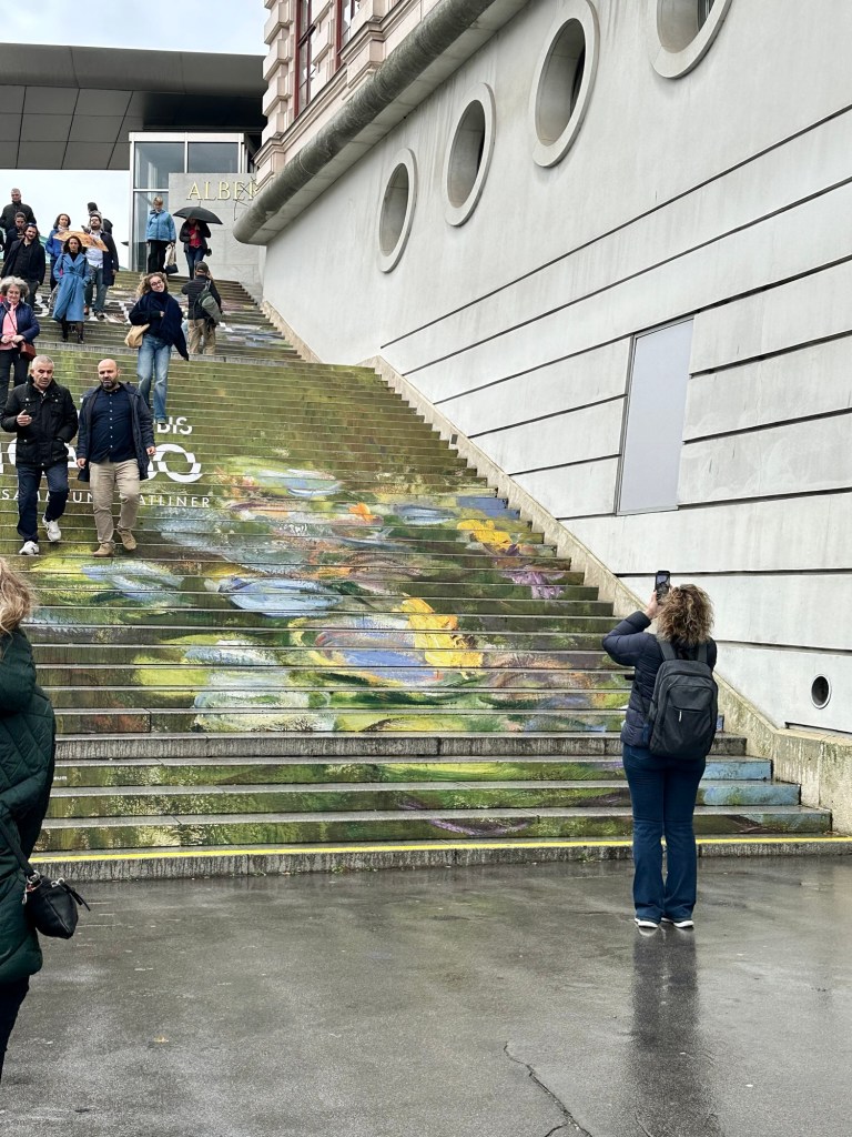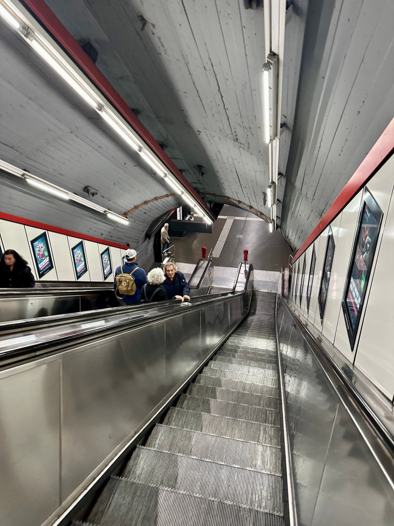 Stairs to the art museumAnyone need a Wiener Dirndl?I walked down the escalator stairs that weren’t working. Greg had to race me down the working one. He won. Easily found the subway line to take us back