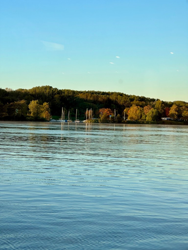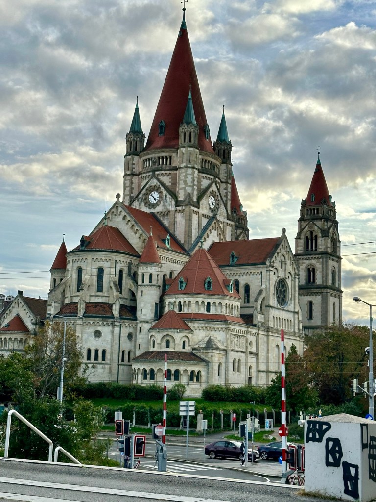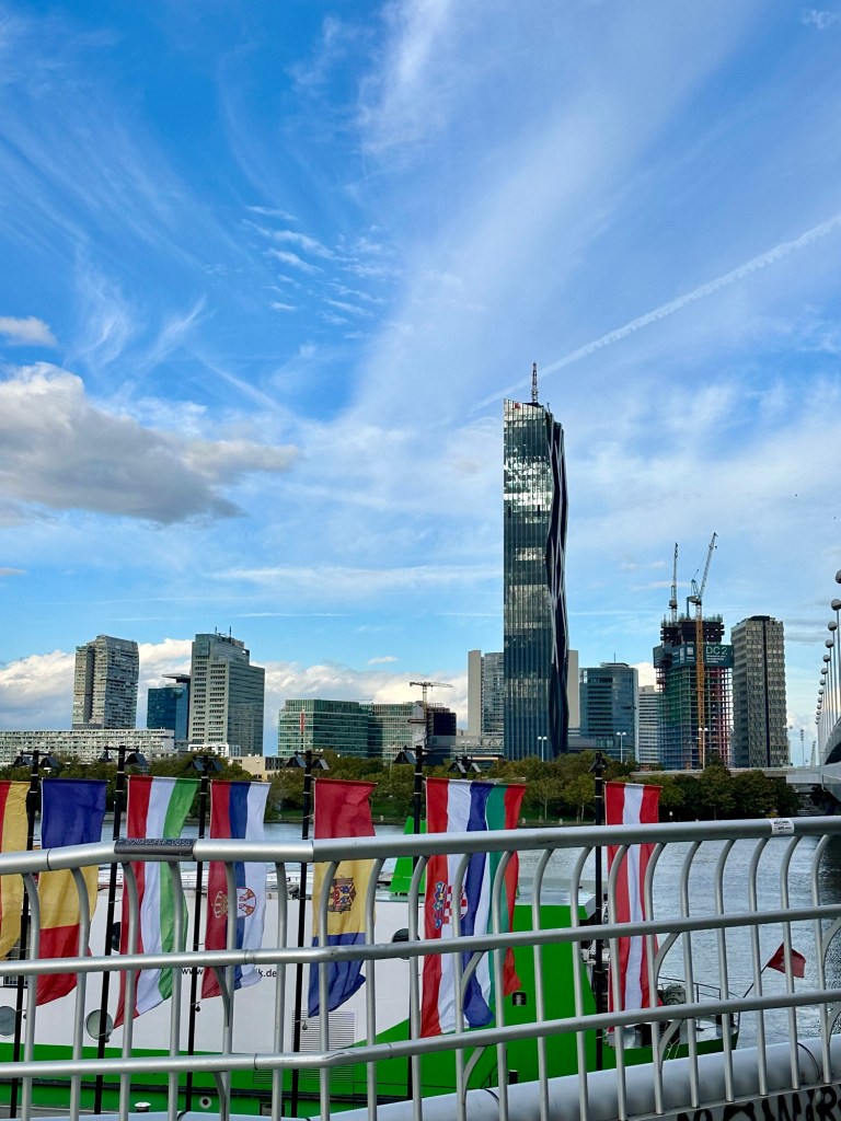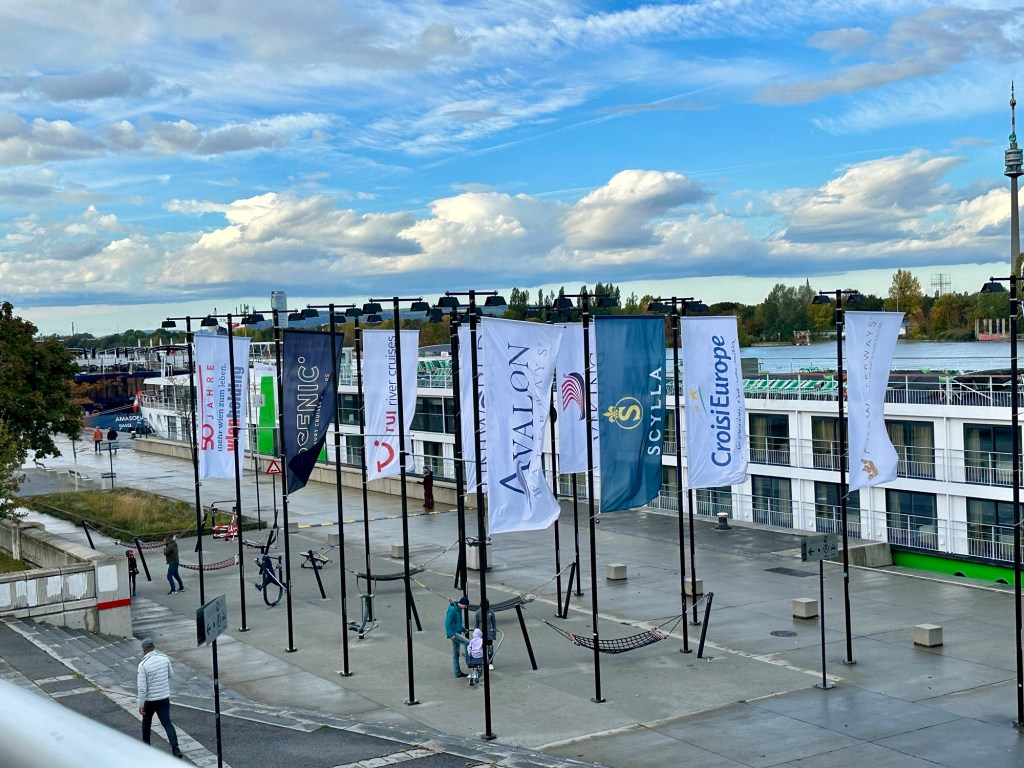 This wiener translate to Vienna. Literally sooooo confused. Haven’t seen a pay phone in a minute. Interesting signNew part of ViennaFlags with all the river cruise lines listed. Below the flags are hammocks and workout equipment for anyone so inclined.Saint Francis of Assisi Church. It’s 150 years old. Another Viking ship docking. It’s truly amazing how nimble these boats are.