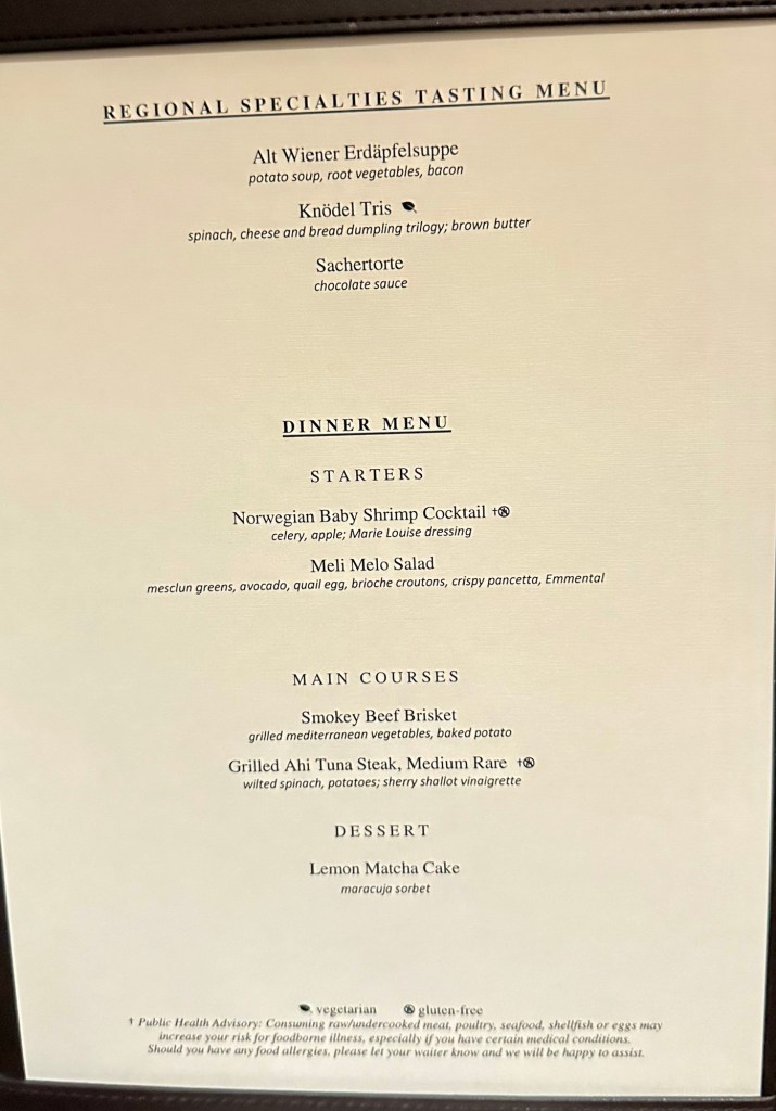 Carey and I decided to skip this evening’s port talk in order to ensure we got a table in Milo’s section. I was under the impression that the restaurant doors opened at 6:45pm (15 mins before dinner and at the same time as the port talk)