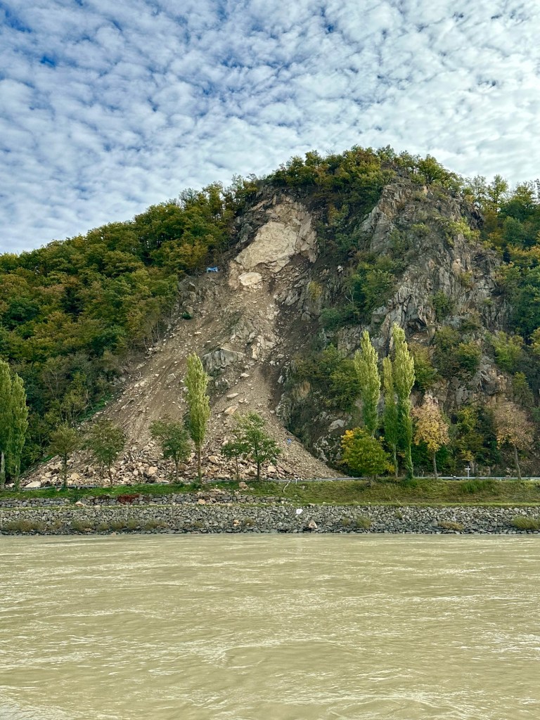 Greg trying to find the source It was coming from some vents close to the water and felt oh so good. Trees changing color Random hotel with a water park in the middle of nowhereWorkers in the vineyardGuessing people were heating their homes with their fireplaces Landslide from the floods last summer